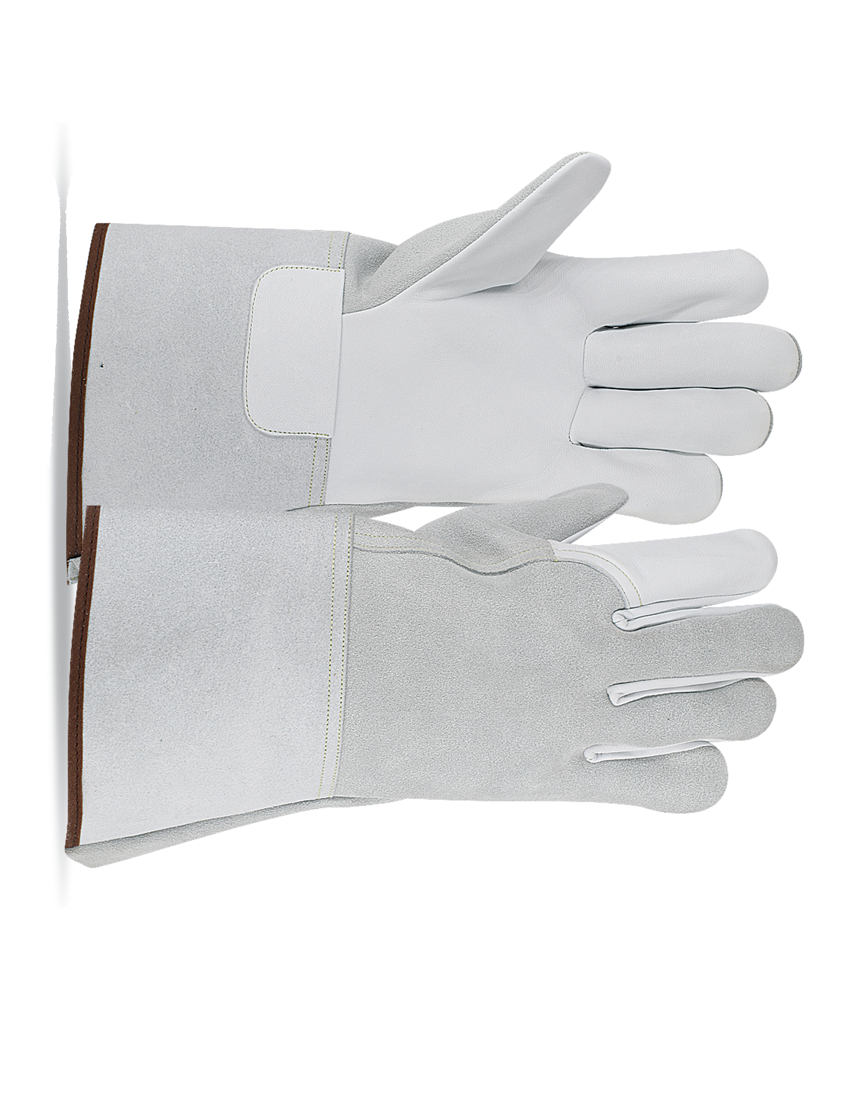 Leather: Goatskins leather palm Colour: Natural Thumb: Wing thumb, Index finger Additional: Natural cow split leather back & cuff, Brown cotton hem Welding Gloves