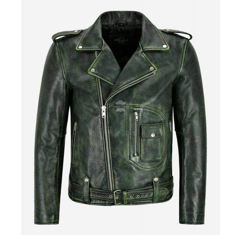 ASTER Men’s Green Vintage Brando Style Leather Biker Jacket
